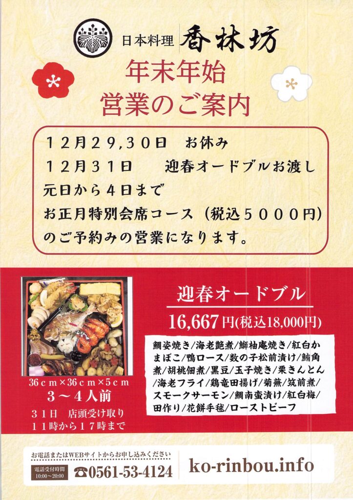 HOME お知らせ 今年も年始の営業します。 ご好評頂いている迎春オードブルのご予約も承ります。 会席コース 法事・慶事・お食い初め・宴会・会食など 個室でゆったりとお食事出来ます。 会席コースはこちら メニュー 平日ランチメニュー/土日祝日メニュー/平日夜メニュー 続きを読む アクセス 香林坊への問い合わせや地図はこちら 続きを読む ギャラリー お部屋や料理の写真を載せていきます。 続きを読む 営業カレンダー